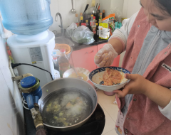 20级金融学积极分子乔亚娟,在五一期间给学做一道家乡菜,虽然不是很熟练,但是在妈妈的悉心教导下她还是学会了如何做这道菜——莜面蘸冷腌汤(就是一种凉汤不是热汤)。