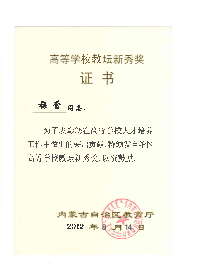 教学教改方面荣获各类奖项13项。主要包括:2012年内蒙古自治区第二届高等公司教坛新秀奖。2012年度包头市优秀教师。2005年公海gh555000aa线路检测第一届“教学优秀奖”,2009年公海gh555000aa线路检测第二届“教学优秀奖”,2011年公海gh555000aa线路检测第三届“教学优秀奖”。2006年校级教学成果奖一等奖1项,2009年校级教学成果奖二等奖2项,2015年校级教学成果奖二等奖1项。
