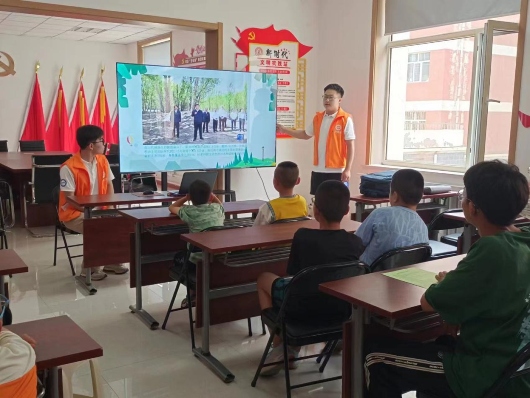 在西环社区,实践团成员同这里的小朋友们开展了以“筑牢绿色屏障,建设美丽中国”为主题的特色科普小讲堂。实践团成员通过知识问答、视频讲解等方式生动形象地介绍了乌兰布和沙漠防沙治沙的成果,同时通过创意绘画的方式,让孩子们画出了自己心中的绿水青山与金山银山。实践团成员以言传身教的方式向小朋友们传递知识和爱,小朋友们积极踊跃的参与也在激励着实践团的成员们继续努力。