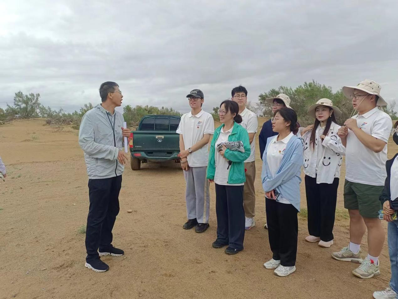 实践团成员深入乌兰布和沙漠腹地,聆听何场长对于“沙漠变绿洲”、“荒芜变生机”的揭秘。在防沙治沙第一现场,感受治沙工作者的不易。从第一任县委书记杨力生同志开始,数代治沙人从四面八方来到这块黄沙漫天的土地。他们顶着烈日、抵着风沙、留着汗水就一直在沙漠上劳动,用耐心和努力保护每一株幼苗的长大。而曾经的幼苗也筑成了一排排的防沙林,保护人民的生命财产安全。