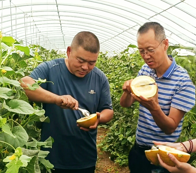 华莱士是磴口县的特色农产品,是当地的“金瓜瓜”。实践团成员走进华莱士瓜研究所的试验育种基地,实地观察华莱士瓜的生长情况。为了更好的打响华莱士这张名片,由当地政府牵头支持,不断通过提纯复壮、新品种选育及原良种繁育,全面提升华莱士品质。更多的毕业老员工选择回到家乡,继续扩大和发扬家乡的“甜蜜事业”。