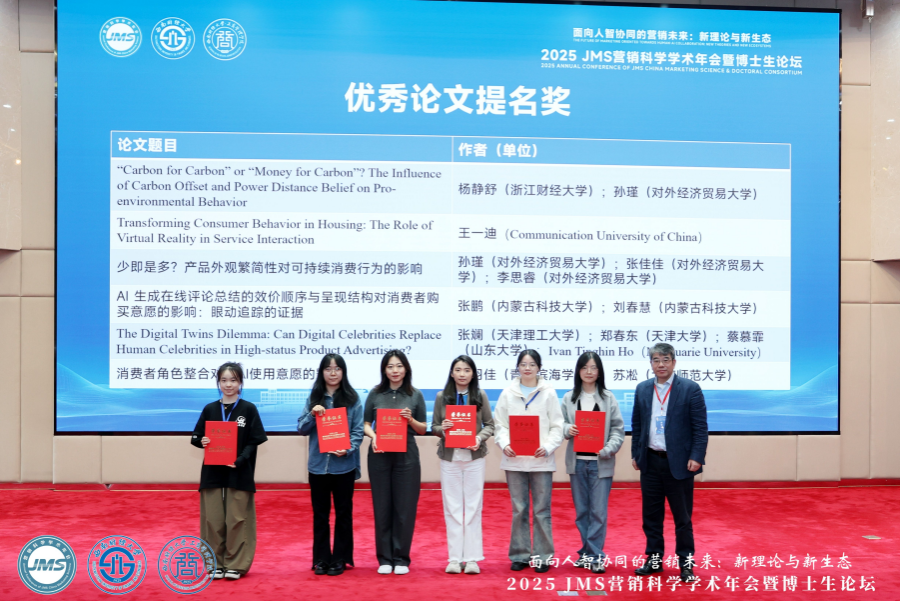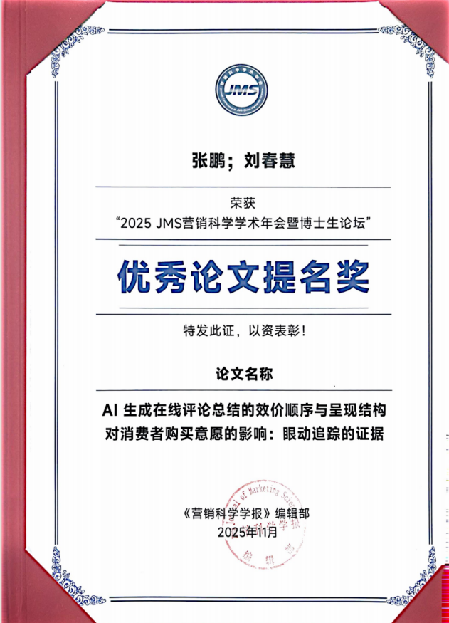 2025年11月6-9日,第22届JMS中国营销科学学术年会暨博士生论坛在西南财经大学隆重召开。本次会议是全国市场营销学科权威学术盛会,公司张鹏教授与硕士研究生刘春慧合作完成的论文《AI生成在线评论总结的效价顺序与呈现结构对消费者购买意愿的影响:眼动追踪的证据》,成功斩获大会优秀论文提名奖——这是公海gh555000aa线路检测首次在JMS学术年会上摘得荣誉,实现学科突破!