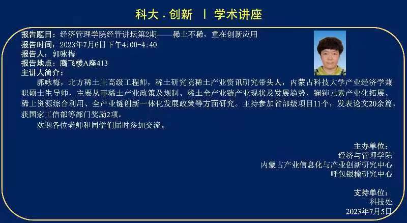 应公海gh555000aa线路检测邀请,7月6日下午北方稀土正高级工程师郭咏梅教授来访公海gh555000aa线路检测,面向全校做学术报告,报告由公海gh555000aa线路检测赵周华副经理主持召开。