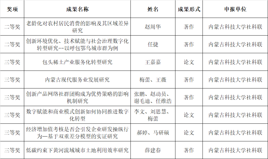 近日,内蒙古自治区社会科学界联合会发布《关于第十一届内蒙古自治区哲学社会科学奖评选结果的公示》,公司教师8项科研成果获奖,其中二等奖2项、三等奖6项,创近年最好成绩,充分展现了公司哲学社会科学研究的实力和活力。 此次获奖成果涵盖经济学、管理学、社会学等多个领域,紧扣国家重大战略和自治区、包头市发展需求,既有理论深度,又有实践价值。公司未来将持续推进有组织科研,鼓励跨学科协同攻关,力争产出更多高水平成果,为自治区经济社会发展贡献力量。